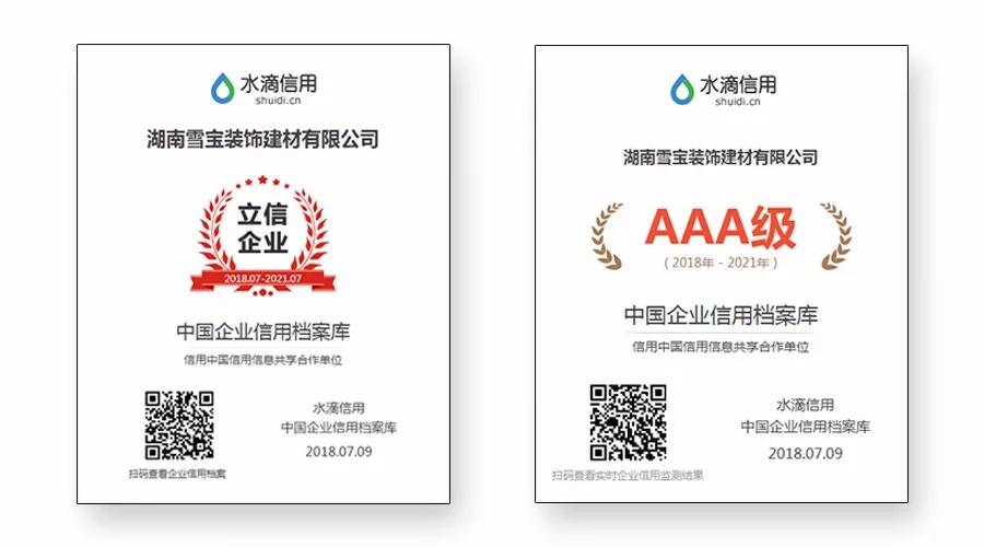 2018年7月9日,湖南雪寶裝飾建材有限公司榮獲由權(quán)威第三方評價機(jī)構(gòu)水滴信用評價中心頒發(fā)的“國家信用體系建設(shè)核心合作伙伴首批誠信推薦企業(yè)——立信企業(yè)”和“AAA級優(yōu)秀企業(yè)信用等級證書”。