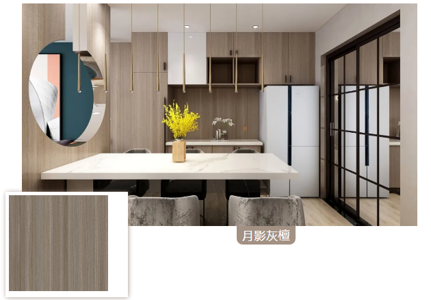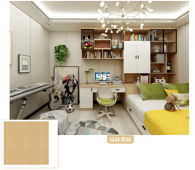 鵝黃色中細膩致密的線條,像晨曦中的密林,輝映著蒼穹暉光,清新典雅的木紋為居室營造溫暖祥和的感覺。