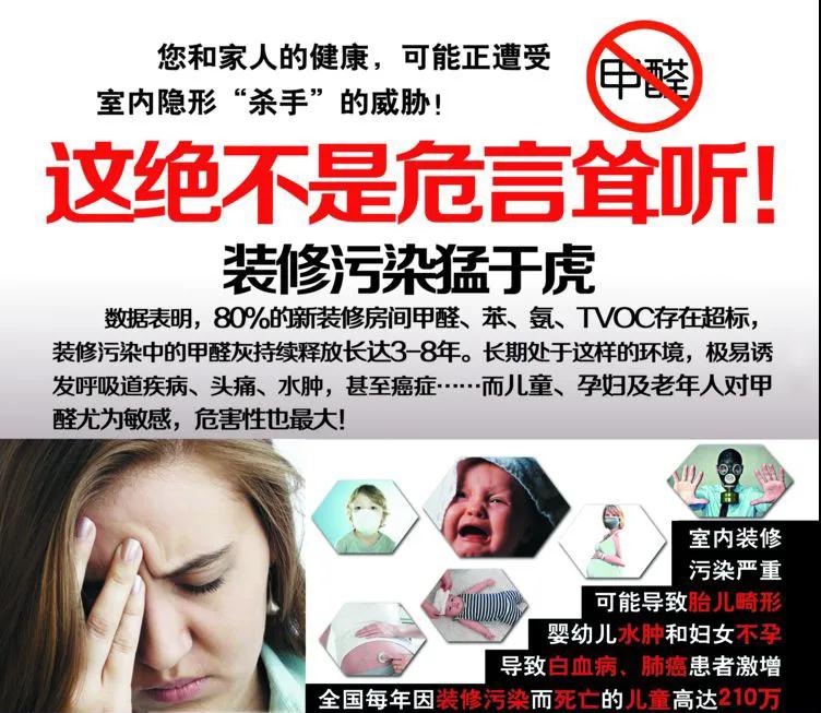 甲醛—:作為一種對(duì)人類最有害的氣體,被譽(yù)為室內(nèi)“奪命殺手”,嚴(yán)重危害新裝修家庭,尤其是兒童、孕婦、老人的身體健康。