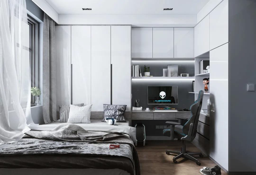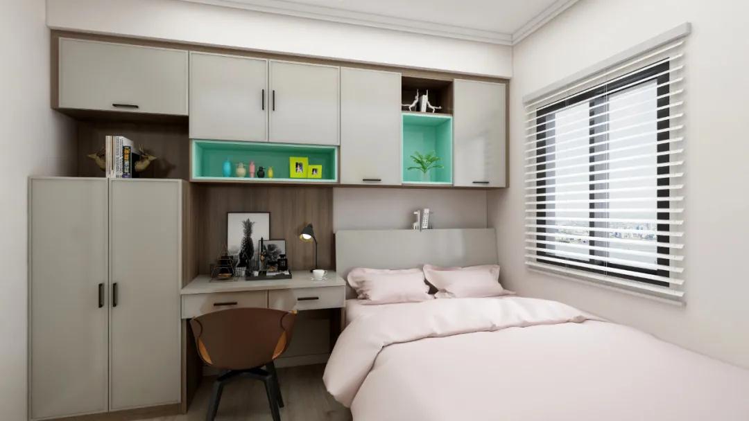 另外,書桌、柜體和床頭整體相連的設計,能合理規(guī)劃布局。