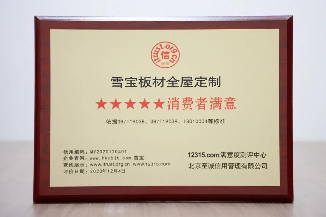 中國(guó)板材國(guó)家品牌「雪寶」獲得由權(quán)威第三方評(píng)價(jià)機(jī)構(gòu)iTrust互聯(lián)網(wǎng)信用評(píng)價(jià)中心、12345.com滿意度測(cè)評(píng)中心共同授予的“客戶滿意度滿意指數(shù)證書”,獲評(píng)為最高滿意等級(jí)5星級(jí)優(yōu)秀企業(yè)。此項(xiàng)星級(jí)認(rèn)證是滿意度指數(shù)評(píng)級(jí)標(biāo)準(zhǔn)需達(dá)到90%及以上才能獲得的資質(zhì),也是滿意度指數(shù)測(cè)評(píng)中可獲得的最高級(jí)別。