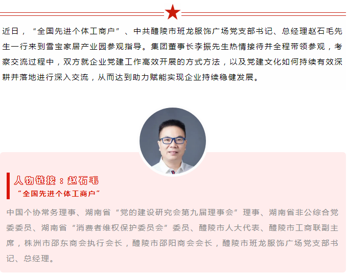 作為其他企業(yè)和政府單位爭相學習黨建工作的對象。因緣際會,在2020年11月,集團董事長李振先生攜部分高管走進趙石毛先生旗下門店“班龍服飾廣場店”參觀學習并深入交流黨建文化落實企業(yè)發(fā)展方面的有效舉措等;