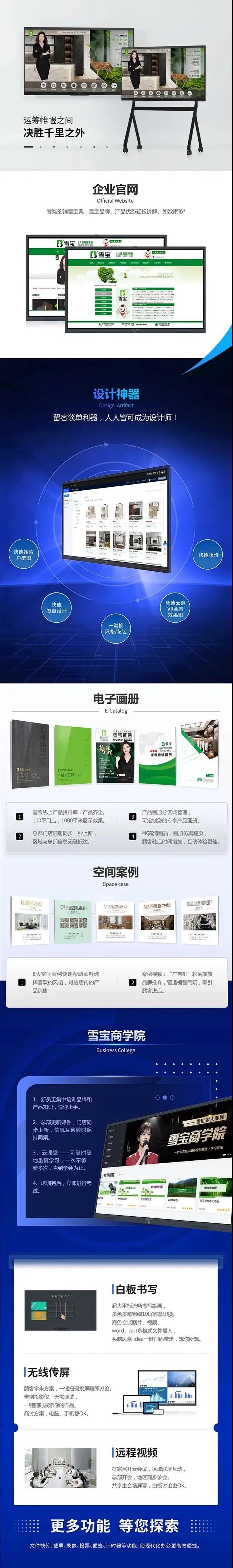 如今有了雪寶智慧云屏的門店,不僅能在有限的實(shí)體空間中展示無限的產(chǎn)品,還能讓消費(fèi)者從“被動(dòng)挑選產(chǎn)品”變?yōu)槟軌蛑鲃?dòng)去參與、體驗(yàn)和互動(dòng),真正實(shí)現(xiàn)全方位面提升顧客入店體驗(yàn)。另外除了“全景圖”功能以外,雪寶智慧云屏還有其他功能為全國各門店賦能,提高門店銷售業(yè)績: