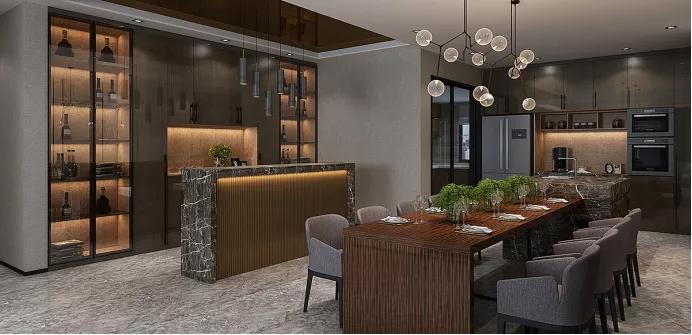金屬酒柜充滿了輕奢氣韻,酒柜陳列錯落有致,精致在一瞬間充分體現(xiàn)。木材、金屬、玻璃的碰撞,別具一格!餐邊柜采用通透的黑色窄框玻璃門搭配,虛實(shí)結(jié)合,提升餐廳氣質(zhì)。