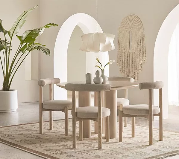 弧形設(shè)計是奶油色家居常見的裝飾元素,如拱門造型、圓弧窗口、半圓弧壁龕等等,直線被柔美曲率中和,弱化了空間的生硬和疏離感。