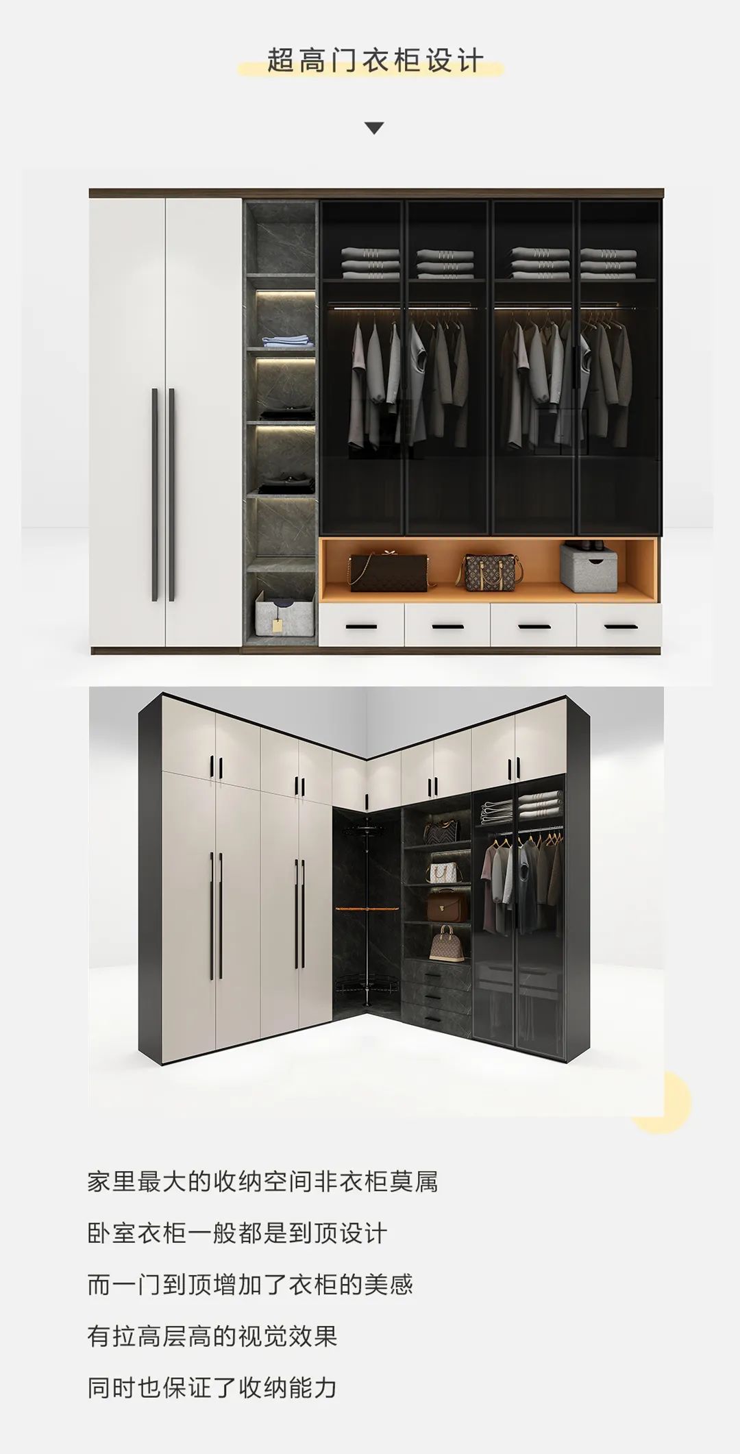 沉浸式打開衣柜,不僅需要高顏值的設(shè)計支撐,這一氣呵成的優(yōu)雅動作,當(dāng)然不希望被上下柜的設(shè)計限制!
