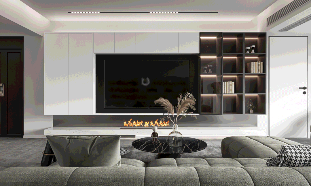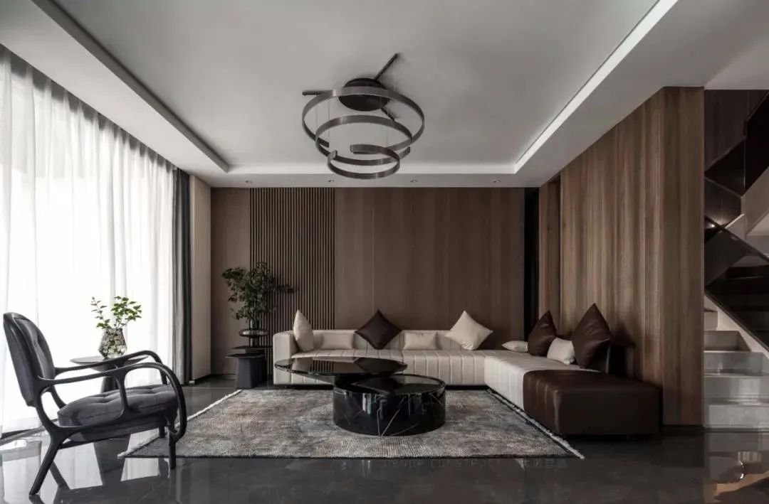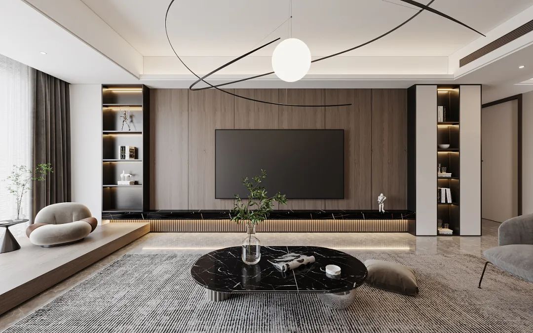在開放式的空間布局,將空間中的飾面墻、電視柜、展示柜、收納柜等進(jìn)行有機(jī)串聯(lián),鋪設(shè)出連貫輕簡(jiǎn)而自如的功能氛圍,不同的飾面表現(xiàn)模式穿插其間,塑造出維度豐富、視覺(jué)飽滿的一體化系統(tǒng),更將優(yōu)雅與沉穩(wěn)彌散進(jìn)空間的每個(gè)角落。