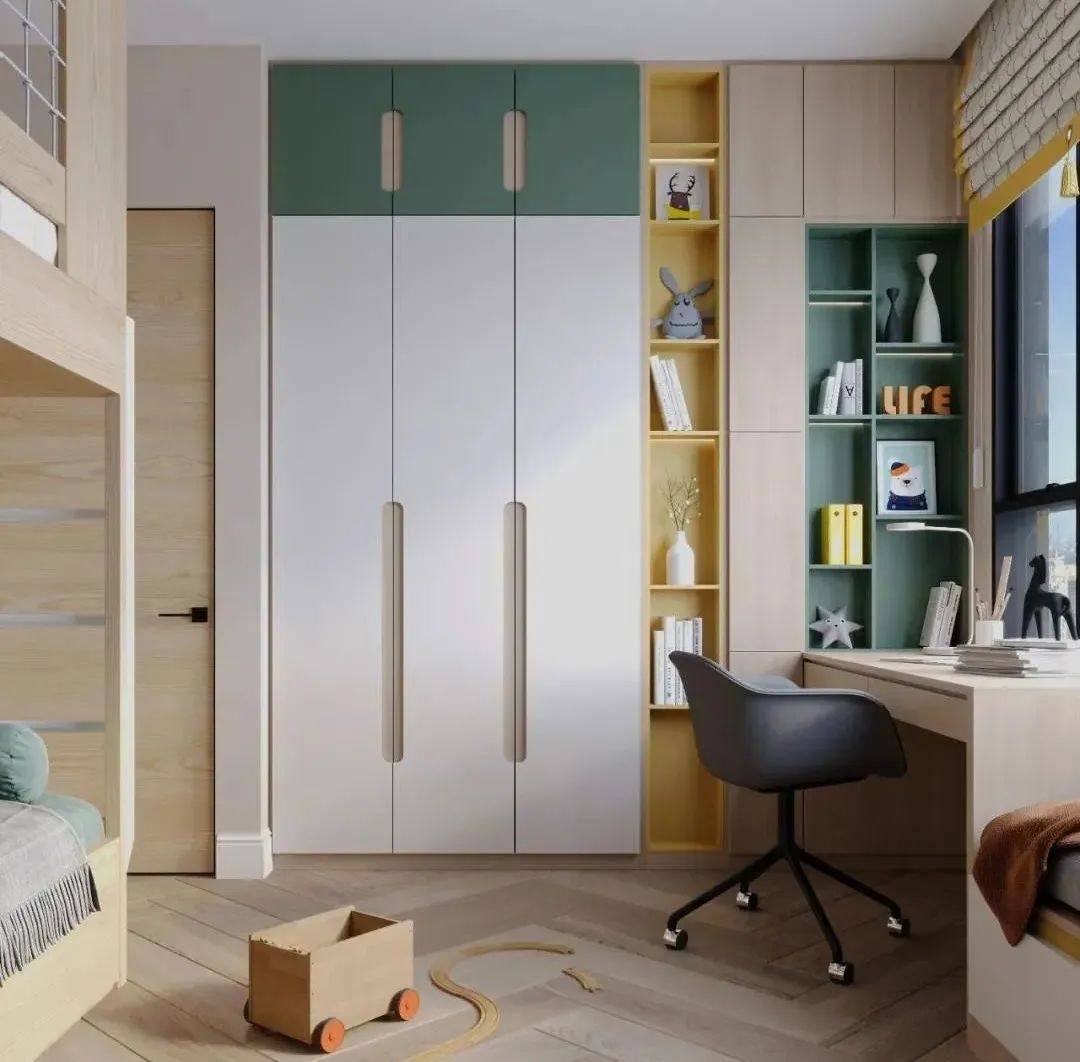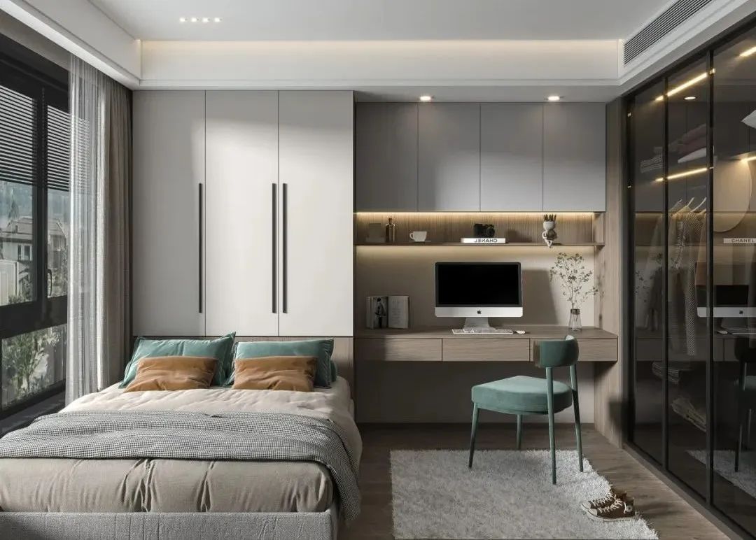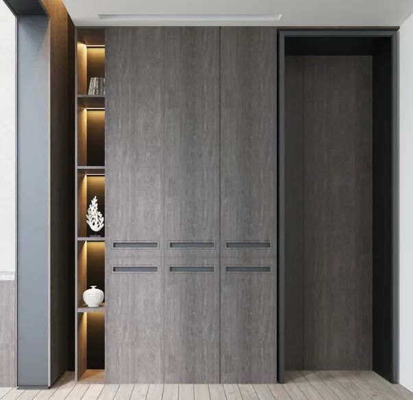 當然,現(xiàn)在還有一種比較尷尬的戶型,那就是臥室門跟電視背景墻在同一側的情況。這時候可以利用柜門與柜體同色系的做法,打造出一款隱形門,既不會影響視覺觀感,還能夠減去敲砌墻的麻煩。