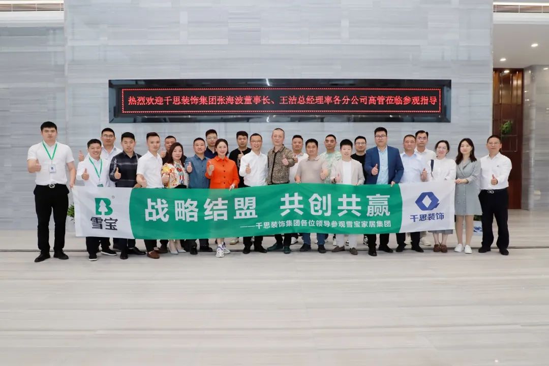 5月8日,千思裝飾集團(tuán)張海波董事長(zhǎng)、王潔總經(jīng)理率各分公司總經(jīng)理及高管一行蒞臨雪寶家居產(chǎn)業(yè)園參觀交流,并成功簽署戰(zhàn)略結(jié)盟合作協(xié)議。