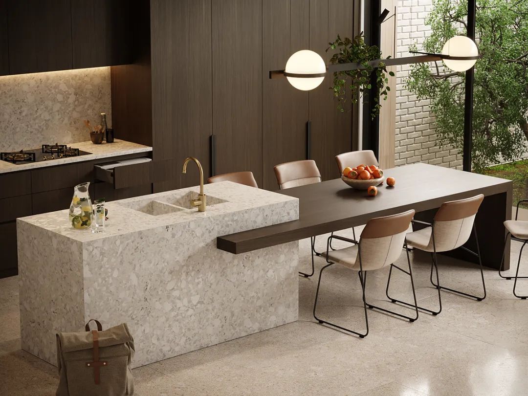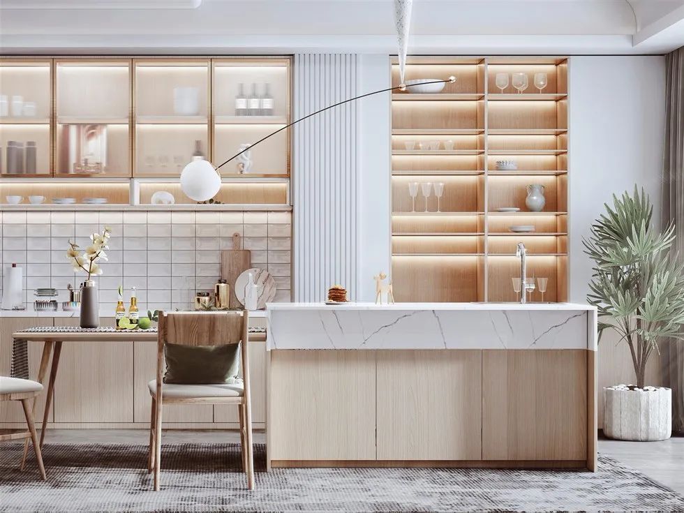 左邊大理石臺+清洗臺,右邊餐桌椅設(shè)計,最合適大橫廳戶型,左邊大理石吧臺,上方可以洗菜和放置洗好的碗碟,里面還可存放大件物品。右邊直接做成餐桌,洗、切、炒、動線十分便利。