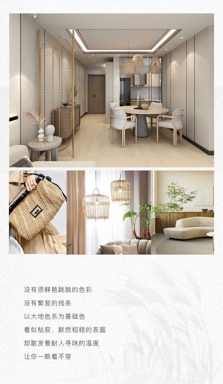 侘寂風(fēng)意境充斥著使用元素的真實(shí)感,物體造型、質(zhì)感、色彩、光澤,都是在看似不完美中體會原始自然,給人純粹質(zhì)樸的視覺感受。