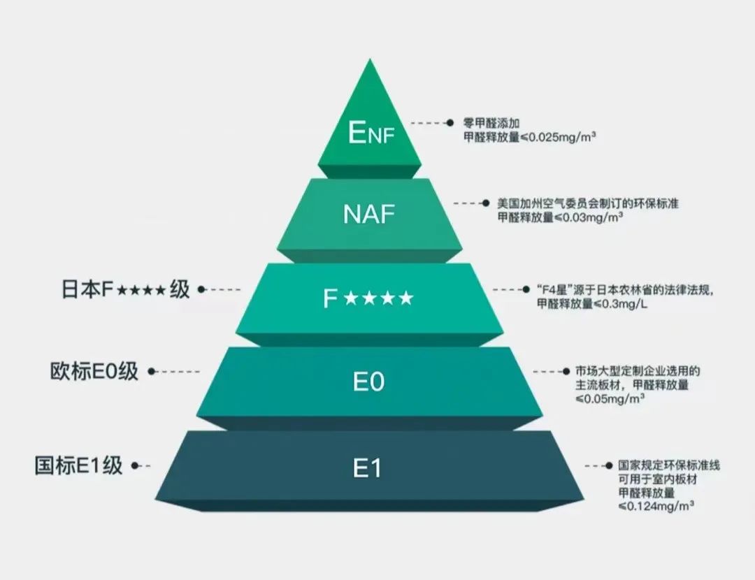 該標準將室內(nèi)用人造板及其制品的甲醛釋放量按照限量值分為3個等級,即E1級(≤0.124mg/m³)、E0級(≤0.050mg/m³)和ENF級(≤0.025mg/m³)。新國標ENF級成為了全球人造板行業(yè)最嚴苛的環(huán)保等級標準,規(guī)定甲醛釋放量數(shù)值超過歐美、日本環(huán)保標準。