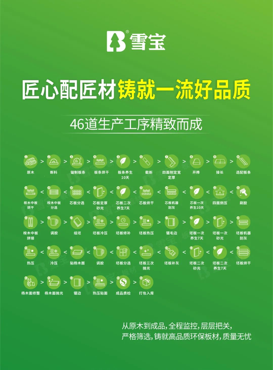 從甄選更優(yōu)質(zhì)的實木原材以確;母鼉(yōu)異,到建立嚴苛的生產(chǎn)工藝標準以保障品質(zhì)更卓越,以及添加無醛的環(huán)保植物大豆膠黏合,雪寶從根本上杜絕甲醛、苯酚等有毒和有害物質(zhì)的釋放。