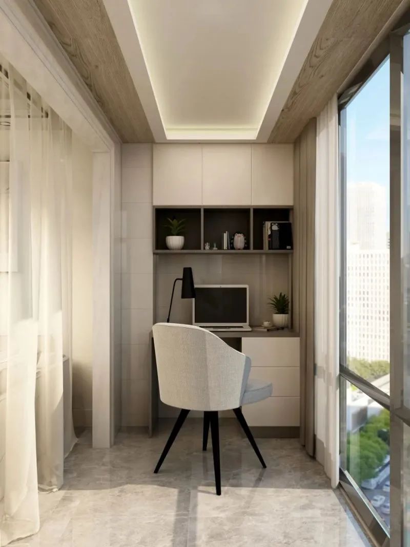 陽臺柜設計得好,可以為陽臺增色不少。陽臺上部分做到頂半開放式吊柜,用來收納和展示。下方做書桌臺面,就能成為一個獨立的辦公區(qū)。陽臺視野寬闊,工作閑暇舉目遠眺,還可放松身心。
