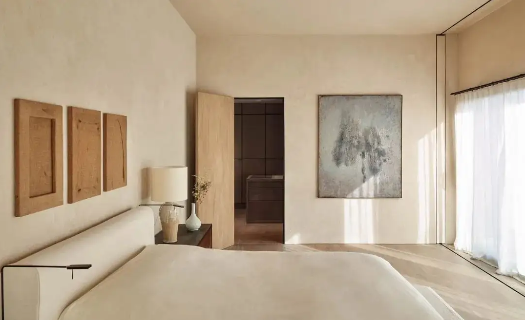 侘寂風多采用天然質(zhì)感的材質(zhì),整體效果質(zhì)樸自然。除卻侘寂本身的質(zhì)感,空間同樣有極簡的美感。