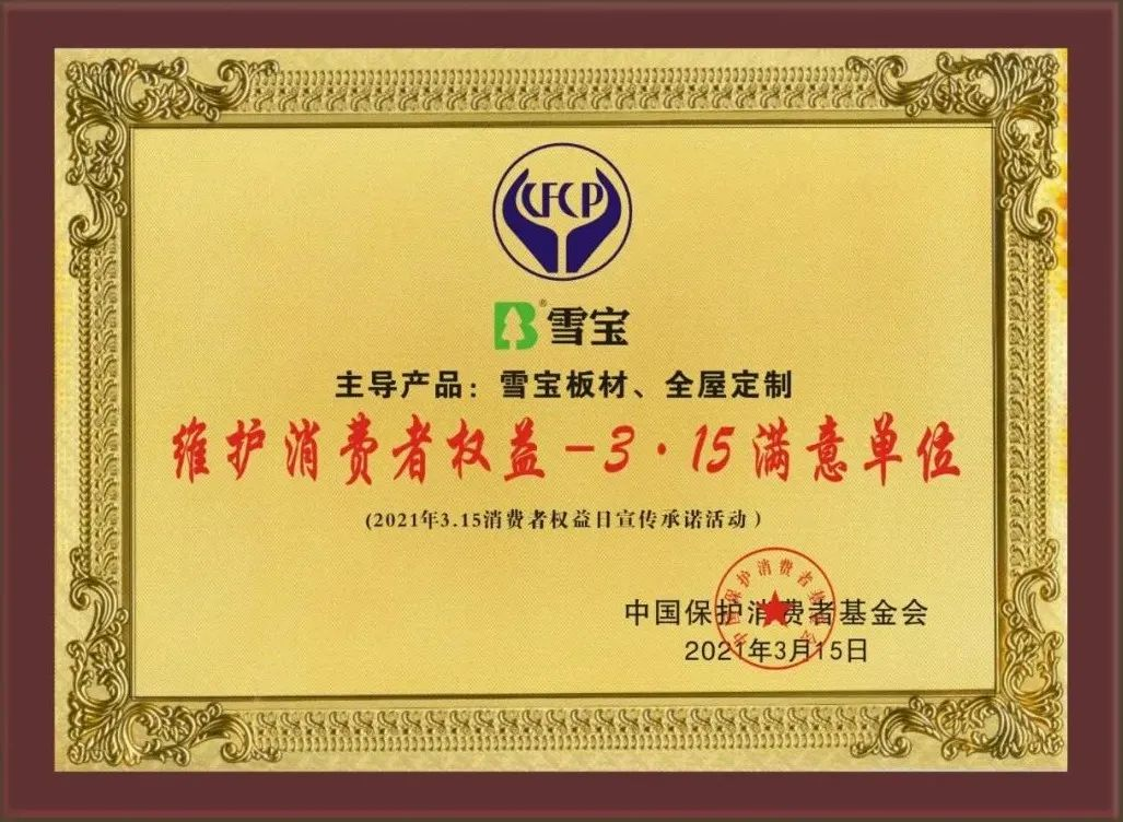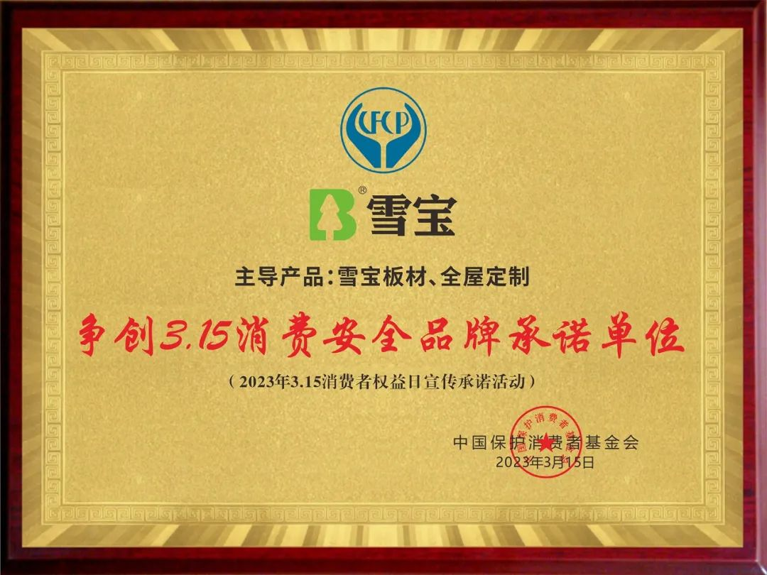 經(jīng)過多輪嚴(yán)格的評(píng)審與篩選,雪寶家居集團(tuán)有限公司主導(dǎo)產(chǎn)品雪寶板材、全屋定制品類以優(yōu)異的產(chǎn)品品質(zhì)和良好的消費(fèi)口碑,被中國(guó)保護(hù)消費(fèi)者基金會(huì)授予“爭(zhēng)創(chuàng)3•15消費(fèi)安全品牌承諾單位”!