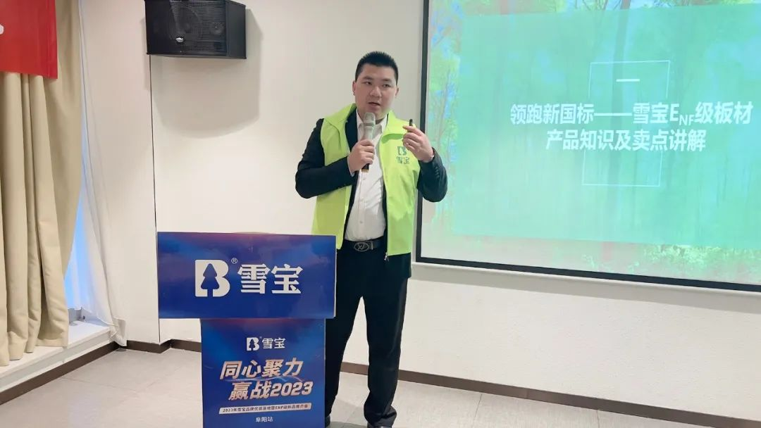 會(huì)上,雪寶華北生態(tài)板事業(yè)部區(qū)域負(fù)責(zé)人曹廣飛先生現(xiàn)場(chǎng)詳細(xì)解讀雪寶ENF級(jí)板材產(chǎn)品知識(shí)及核心賣(mài)點(diǎn)。