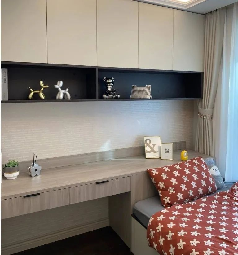 臥室安靜隱蔽,十分適合辦公或者寫(xiě)作業(yè)。床頭柜+書(shū)桌一體化后,不僅可以收納物品,還打造了一個(gè)學(xué)習(xí)區(qū)域,讓臥室空間實(shí)現(xiàn)一房?jī)捎。兩者重合?huì)自然呈現(xiàn)一個(gè)高度差,提升空間的功能性的同時(shí),增加了臥室的靈動(dòng)性。