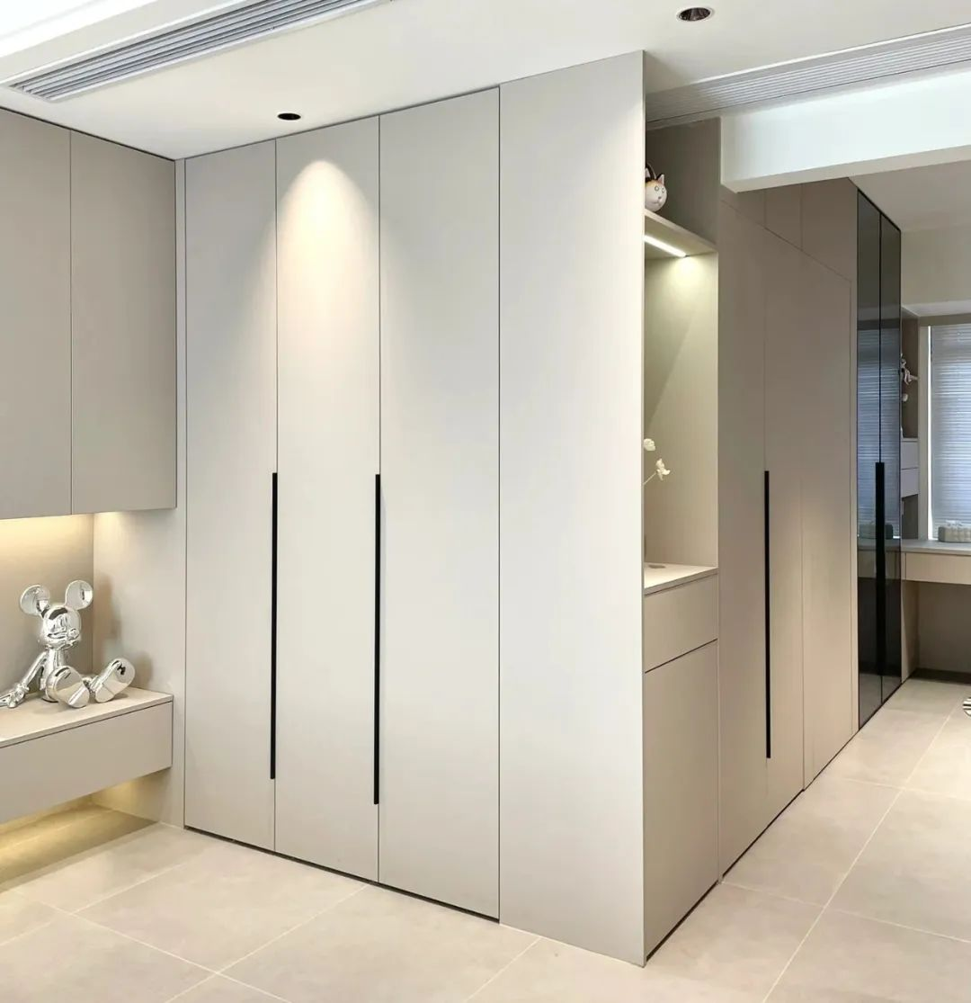 免拉手設(shè)計(jì)堪稱柜門利器,沒有拉手的柜門,立面整潔清爽。而門墻柜一體化設(shè)計(jì)則實(shí)現(xiàn)了門、墻、柜串聯(lián)為一體的布局,柜體瞬間高級(jí)起來,美觀度直線提升,還能增強(qiáng)空間縱深感。
