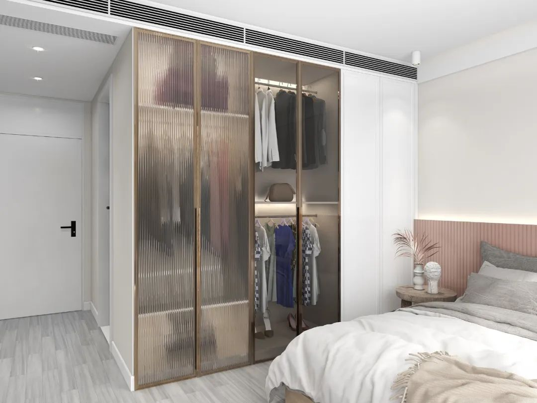 金屬框玻璃門板營(yíng)造的輕奢空間氛圍,讓高級(jí)感融入生活。磨砂質(zhì)感或是茶色玻璃柜門,朦朧模糊的鏡面,無形中增添了空間的藝術(shù)美感。