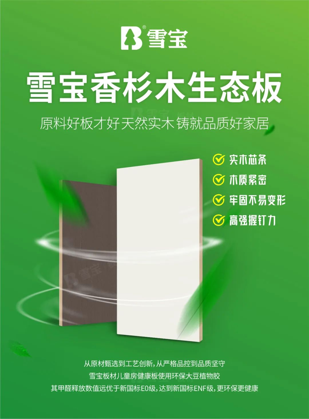 不做醛材,只做高品質(zhì)環(huán)保板材!作為行業(yè)先行創(chuàng)建兒童房健康板高品質(zhì)標(biāo)準(zhǔn)的雪寶板材,無論選材、工藝、品質(zhì)、服務(wù)、口碑等諸多方面,都有著絕對(duì)優(yōu)勢(shì)和傲人成績(jī)!