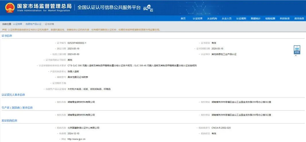 在嚴(yán)謹(jǐn)、科學(xué)的評估體系下,雪寶得到了北京國建聯(lián)信認證中心有限公司的專業(yè)認可,成功獲得無醛人造板制品分級認證證書,驗證了雪寶板材系列產(chǎn)品飾面人造板ENF級甲醛釋放量≤0.025mg/m³。另外該證書已經(jīng)在國家市場監(jiān)督管理總局官網(wǎng)公示,并進行查詢。