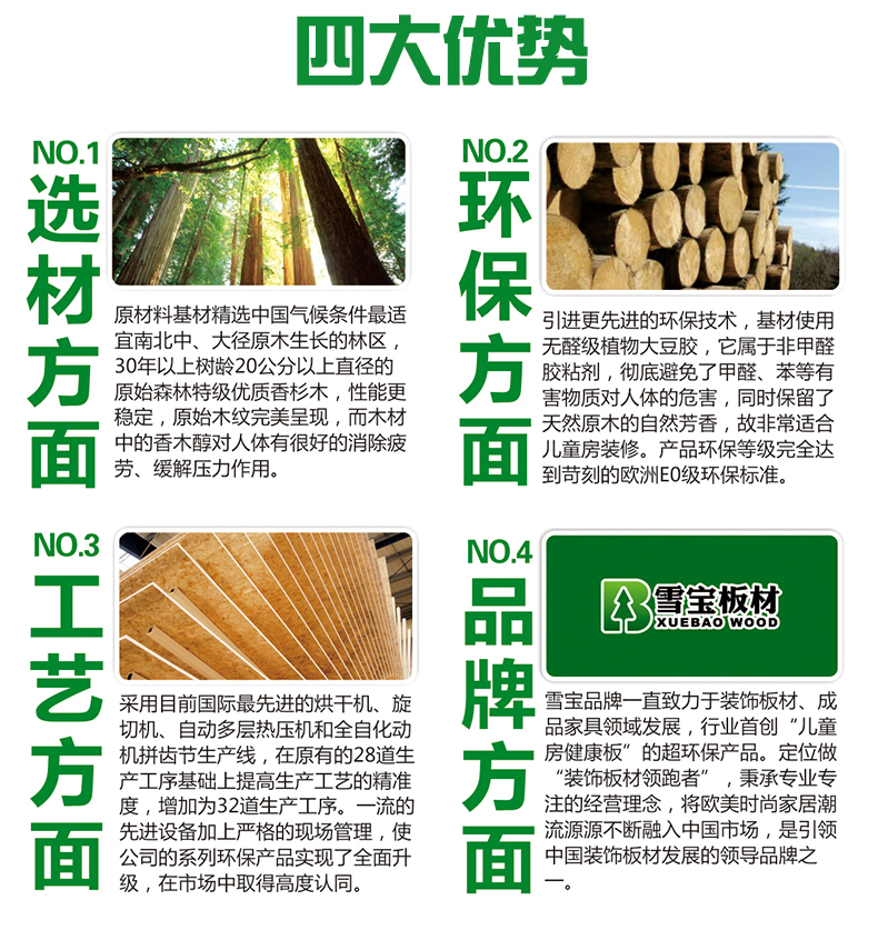 - 香港雪寶免漆生態(tài)板芯材為規(guī)格均勻一致的全精方芯條,精選國際潮流花色紙浸漬,色彩高雅,色澤鮮活飽滿;同時其免去傳統(tǒng)工藝流程中油漆、飾面等工序,整體裝修省料省時又實(shí)惠;并且其表面硬度好、耐沖擊、隔音,具有耐洗、耐磨、防潮、不沾灰塵,防一般的酸、堿腐蝕,家具保養(yǎng)起來簡單方便。香港雪寶生態(tài)板逾百種風(fēng)格款式,以及個性定制,能滿足您與眾不同的時尚裝修要求。