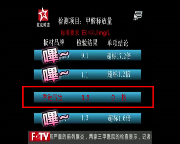 政法頻道3.15期間特別節(jié)目《陽光下的315》中,記者暗訪了某大型建材市場中的各板材專賣店,也抽取了其中某些品牌產品進行甲醛釋放量檢測,其中雪寶E0級別的板材也被隨機抽查,與其它品牌板材一起接受了檢驗。