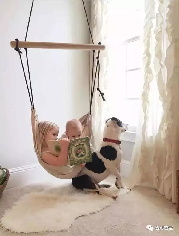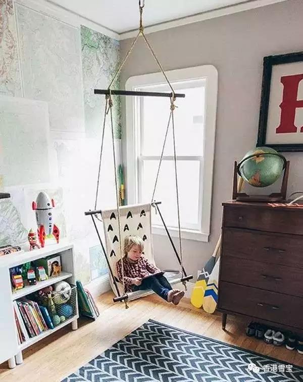 ▲在臥室里裝一個小吊椅看起來不錯。在保證安全的情況下,家庭中適當?shù)膴蕵泛拖灿兄谂囵B(yǎng)孩子活潑開朗的個性。