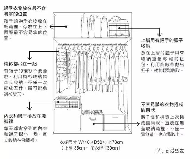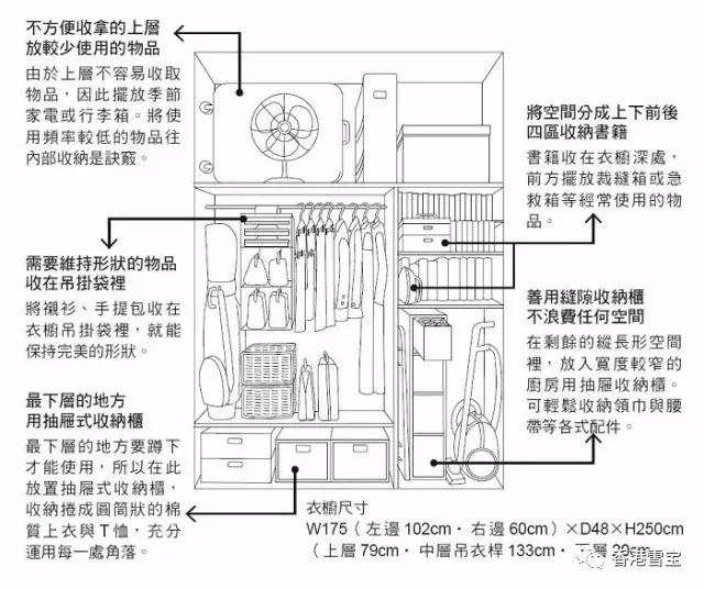 由于上層不容易收取,因此擺放過季或者不常用的物品。將使用頻率較低的物品往內(nèi)部收納是訣竅。