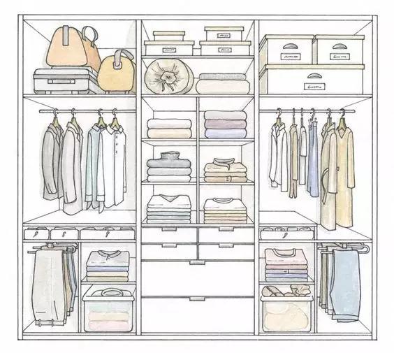 同時(shí)對(duì)目前的衣服數(shù)量與類(lèi)別有清晰的了解,能夠確定衣柜的大小;對(duì)衣服進(jìn)行分類(lèi),并為其安排合適的收納方式(平疊、豎疊、懸掛);根據(jù)衣服的比例分配掛桿、隔板、抽屜的位置與數(shù)量,并為后期的變動(dòng)留出可以調(diào)整的空間。