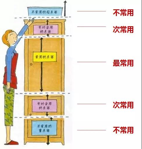 從上圖可以看出,應(yīng)當(dāng)在哪一區(qū)域放置不同類(lèi)型的衣物。最上面和最下面放置被褥或不常用、過(guò)季的衣物,觸手可及的區(qū)域放置我們每天都會(huì)用到的衣物。